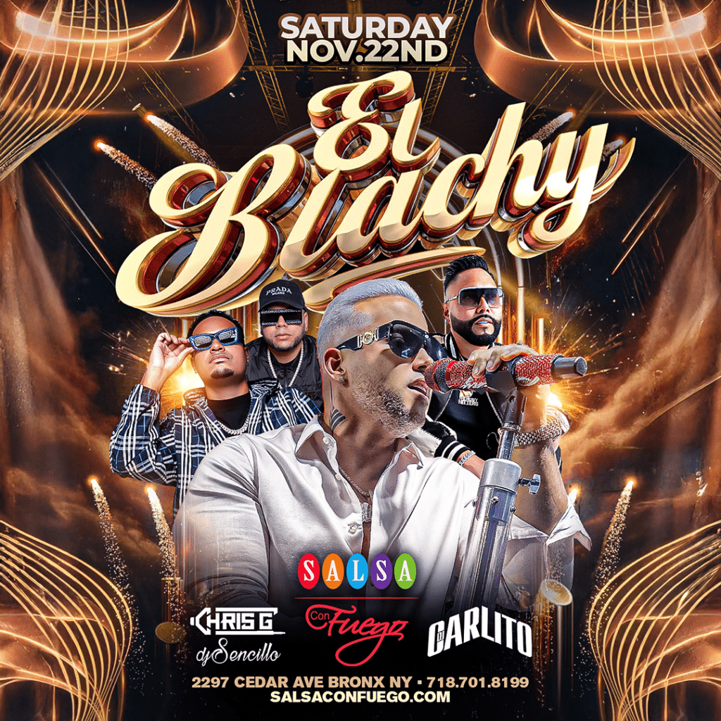 Disfruta de una noche especial de música latina con El Blachy en concierto en Salsa Con Fuego en el Bronx el sábado, 22 de noviembre de 2025. Reconocido por su estilo único y trayectoria internacional, El Blachy se presentará en uno de los escenarios más importantes de Nueva York.